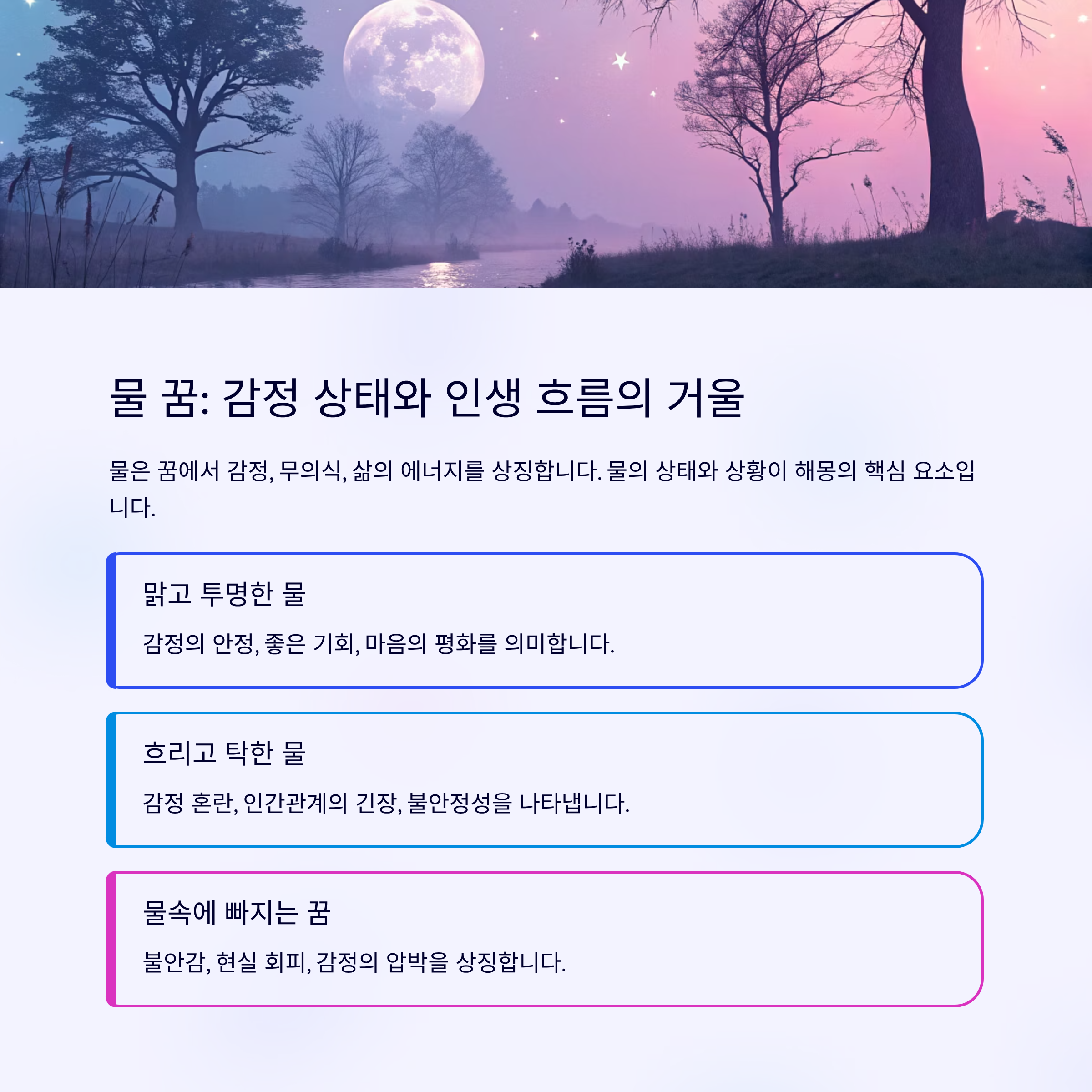 | 맑고 투명한 물 | 감정의 안정, 좋은 기회, 마음의 평화 |