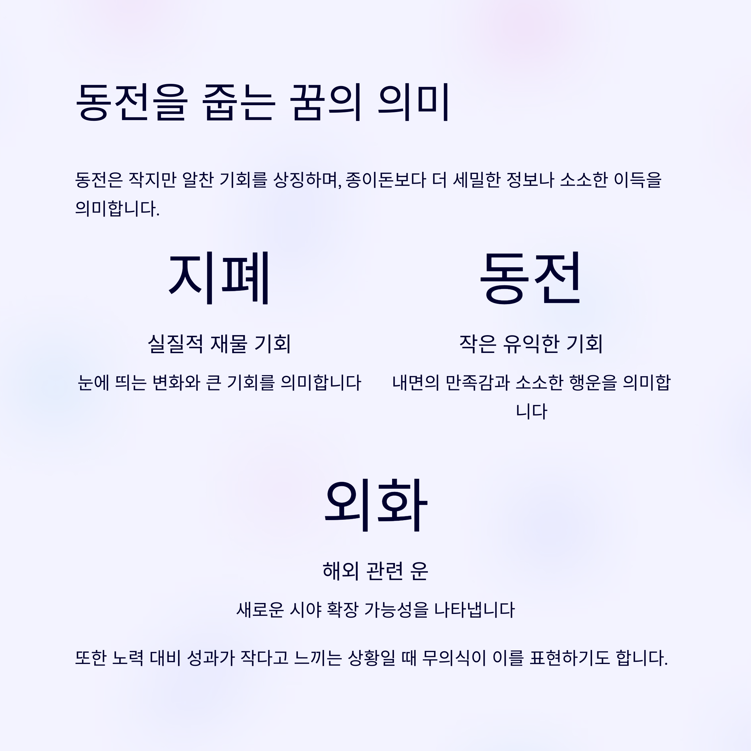 | 동전 | 작지만 유익한 기회, 내면의 만족감 |
